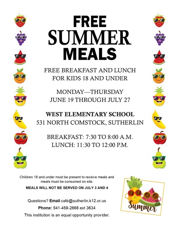 Summer Food Program: free breakfast and lunch for all youth under 18, served at West Intermediate School, Monday -Thursday, June 19- July 27.